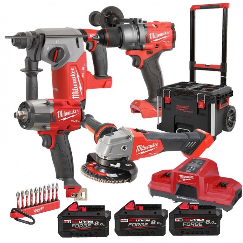 Dotazione: Trolley Milwaukee Tassellatore M18 FH-0, Trapano avvitatore M18FPD3-0, Smerigliatrice M18 FSAG125-0XB, Avvitatore impulsi M18 FMTIW2F, 3 Batterie 8 Ah FORGE e caricabatterie rapido simultaneo. Carica Due Batterie in 49 minuti