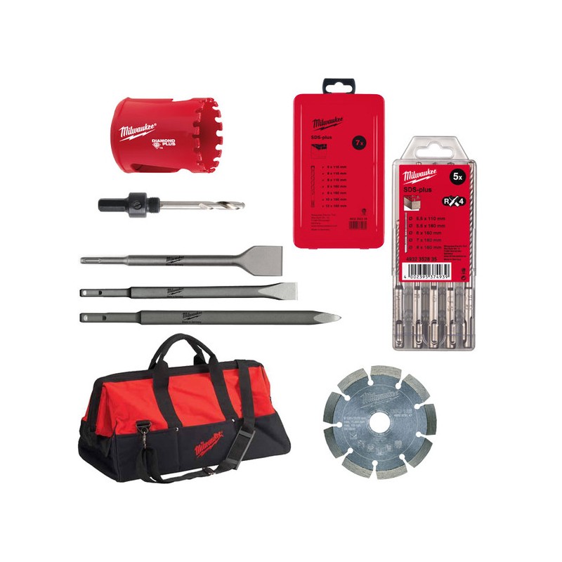 Kit Milwaukee edilizia contenente set di punte SDS da 5 e 7 pz, set di scalpelli Sds-plus e disco diamantato. Approfitta dell'offerta. Consegna in 24/48 ore.