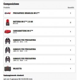 Equipaggiamento standard: set con 3 ganasce M (15/22/28 mm), 2 batterie 2,0 Ah e caricabatterie. Consegna 72 ore