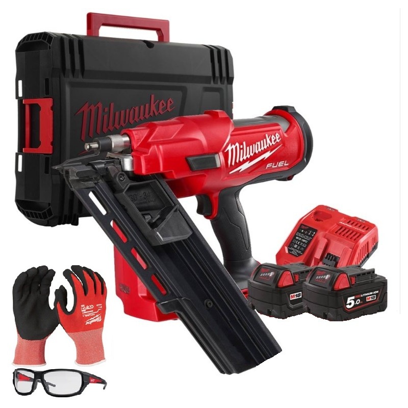 Chiodatrice a batteria Milwaukee M18 FFNS-502C Sku Ean 4058546344795 Sku 4933478302 Compatibile con chiodi 30° - 34°, con lunghezza 50 - 90mm, diametro 2,9 - 3,3 mm a gambo liscio o ad anelli, a testa a semiluna o fuori asse